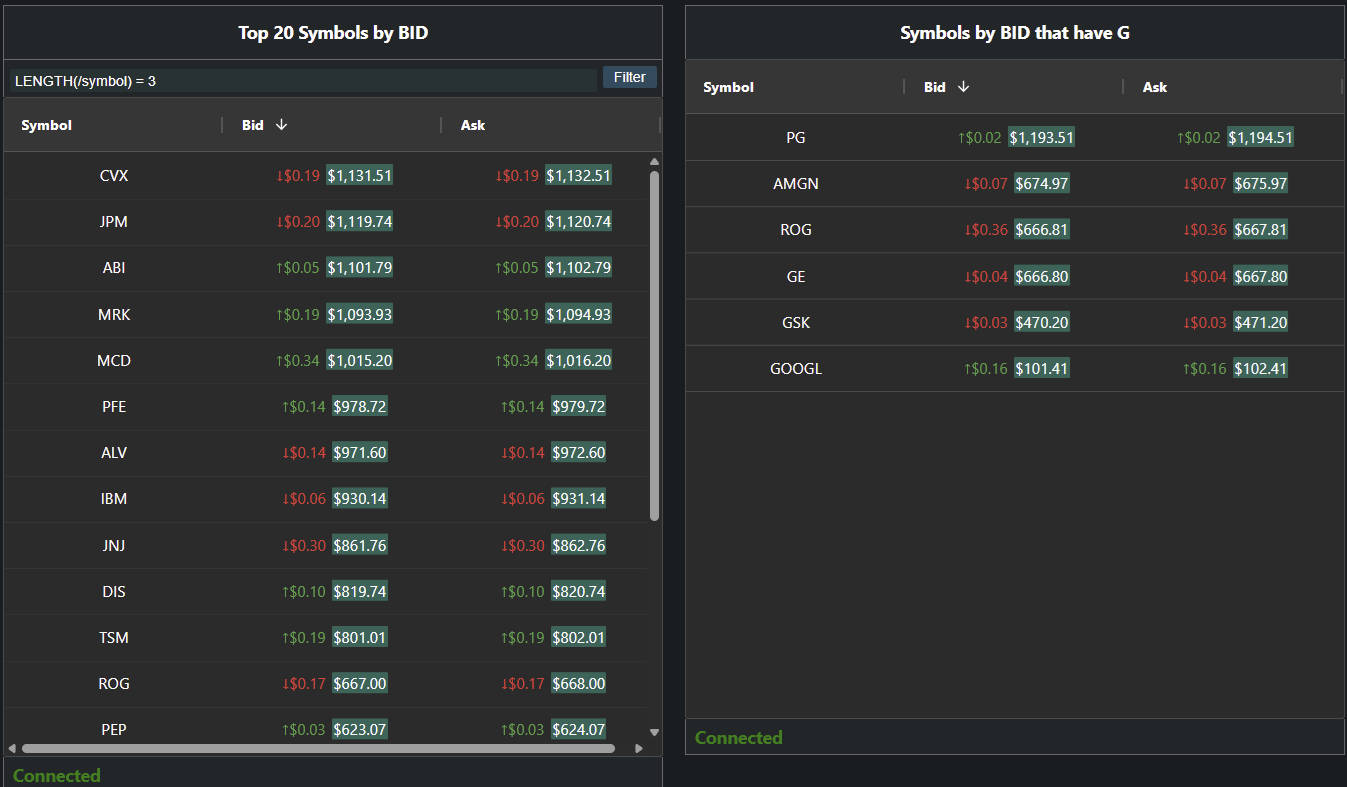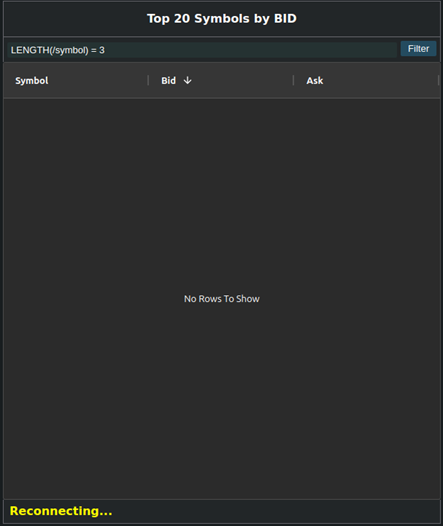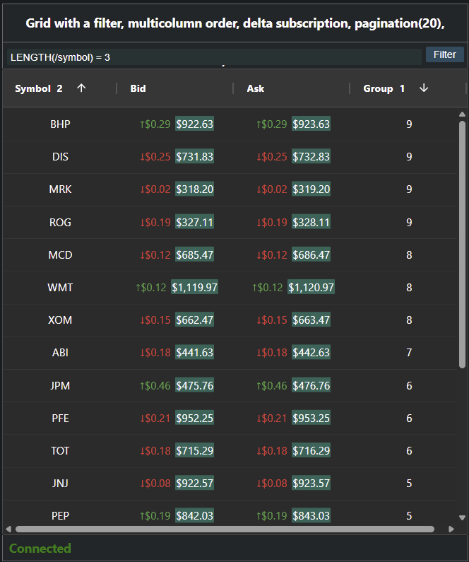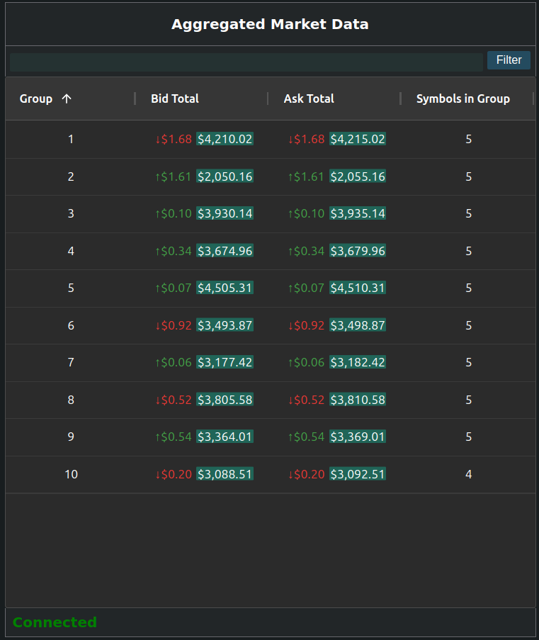 /countis the number of the entries in each group of symbols. We're using theCOUNT()aggregate function for this;/bid_totaland/ask_totalare sums of bids and asks in each group by using theSUM()aggregate function;/groupis a simple projection of the group value -- no aggregations are applied here.