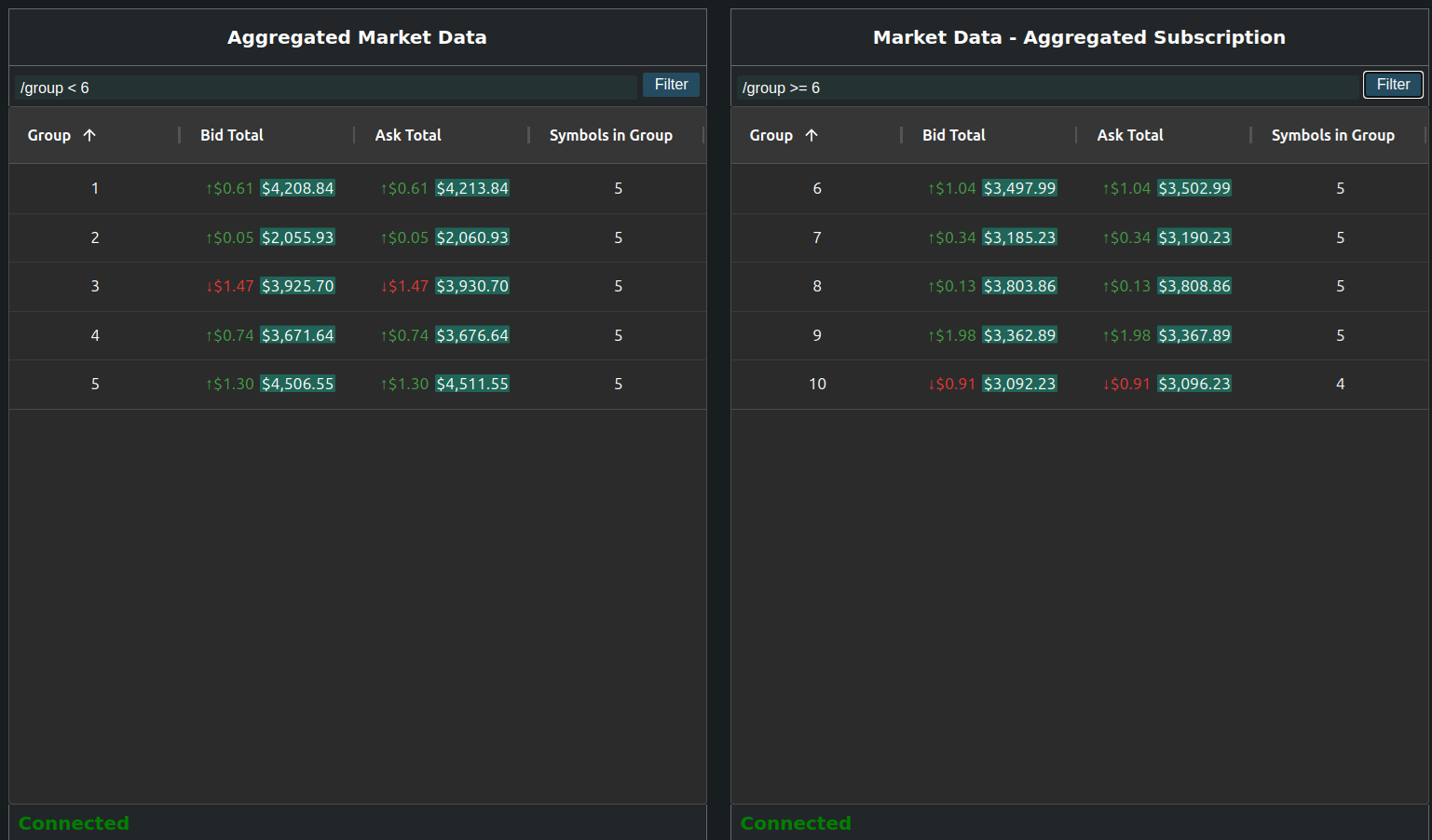 Once the view is defined, stop and restart the AMPS Server again. Now the agg_market_data topic can be queried and subscribed in